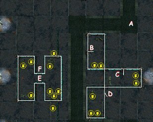 Strategic report : By Troy : A : this is the exit point. B : this is a fairly easy one. Jump to the B which is just behind the small wall. From there the enemy cannot see you so they will not shoot. The will allow you to shoot when your turn comes up again. Kill the two guy's and you will be well on your way. C : this is a fairly easy one. Jump to the C which is just behind the small wall. From there the enemy cannot see you so they will not shoot. The will allow you to shoot when your turn comes up again. Kill the two guy's and Go to D. D : about now ammo is getting low. Three shots to kill the three sca'gar at the start, 2 for each Pyr'Coo, there WERE 4 of them so you probably have used 11. This gives you one kill easily, but two is pushing it. You should be at the door, open it with full movement, kill the guy just inside the door, close it, and jump to the ammo just over the wall. All this is done in one turn. Your turn is now, over. The Pyr'Coo will have jumped over to you on their turn. Open the chest and you have 4 moves to deal with them. One can be killed easily. If you are not sure about the other jump over the wall with your last move. He will be forced to jump and you can kill him then. These chest are then easy for the taking. E : BE SURE YOU ARE JUMPING INTO THE EXACT MIDDLE ! You will be seen anywhere else. Jumping to the F might be easier first. You don't want the guys on the outside to see you either way.You'll want to clear out the side with the ammo box. Go in kill a guy and jump out. The other will follow. Kill them, hope you still have ammo. Jump back in open the ammo, get the chests and do the same thing on the other side of the H. Now that you have all the chests you can go to the exit point A. F : this is a safe spot that can be used to effecivly lure the enemy into a hall when you jump out of the middle. That way you don't get surrounded.